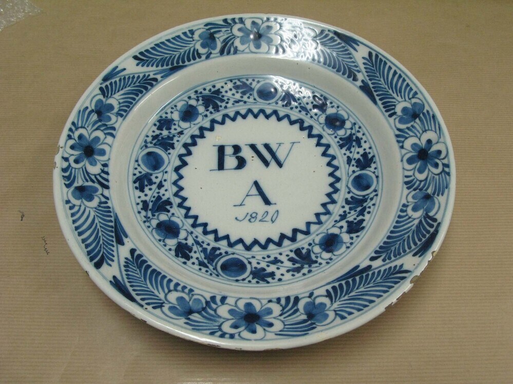 In 1820 vierde het Amsterdamse Burgerweeshuis zijn driehonderdjarig bestaan. Vanaf de oprichting in 1520 konden kinderen van Amsterdamse poorters (burgers met rechten om in de stad te wonen) die geen ouders of een moeilijke thuissituatie hadden, in het weeshuishuis terecht. Op 6 april 1820 werd het jubileum uitbundig gevierd met een feestrede van burgemeester en Regent van het Burgerweeshuis Frederik van de Poll en een optreden van een koor van weeskinderen voor onder meer koning Willem I. De Burgerwezen kregen een feestmaaltijd en een speciale medaille. Naar aanleiding van de feestviering zijn twee series borden besteld bij de Plateelbakkerij in Delft. Van deze serie zijn 44 exemplaren bewaard gebleven. ( Sarah Remmerts de Vries)