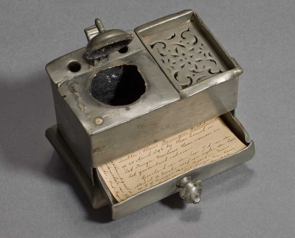 Dit inktstel is afkomstig uit het Amsterdamse Burgerweeshuis. In het Burgerweeshuis konden kinderen van Amsterdamse poorters (burgers met rechten om in de stad te wonen) terecht, die geen ouders of een moeilijke thuissituatie hadden. Het Burgerweeshuis werd in de negentiende eeuw tweemaal vereerd door een bezoek van koningin Emma. Op 26 april 1879 bracht zij samen met haar echtgenoot koning Willem III een eerste bezoek aan de instelling, en op 24 april 1896 samen met haar dochter koningin Wilhelmina (1880-1962) een tweede. Dit inkstel is tijdens een van beide bezoeken door haar gebruikt om mee te schrijven. ( Sarah Remmerts de Vries)