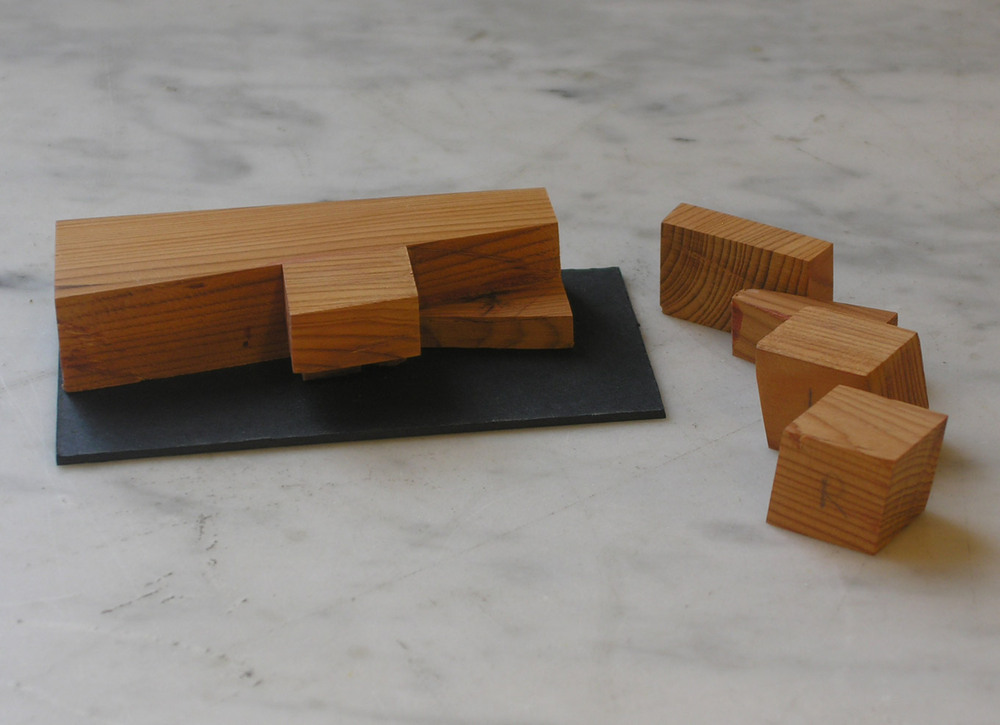 Zes onderdelen: houten basismaquette op zwart karton gelijmd. Kartonnetje past in ander zwart kartonnetje (bodemplaatje). Bij maquette horen nog vier losse houten blokjes, op twee blokjes is met potlood letter 'L' en 'R' geschreven.