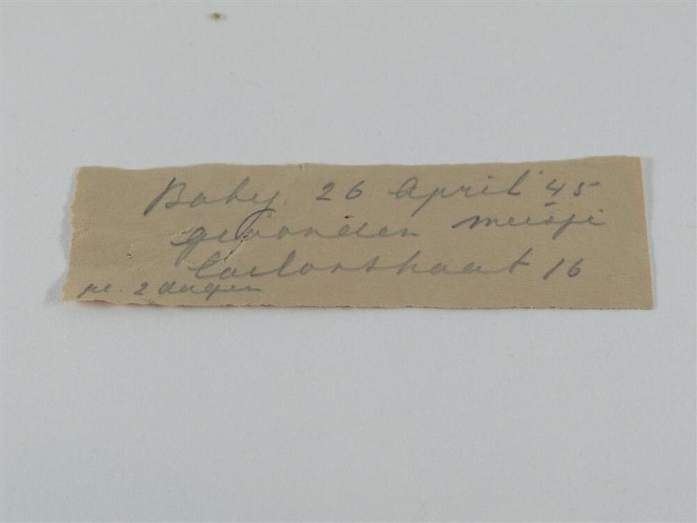 - opschrift briefje: baby 26 april '45/ gevonden meisje/ Carlonstraat 16*/ pl. 2 dagen : * bedoeld is wellicht de Carillonstraat bij de Van Woutstraat