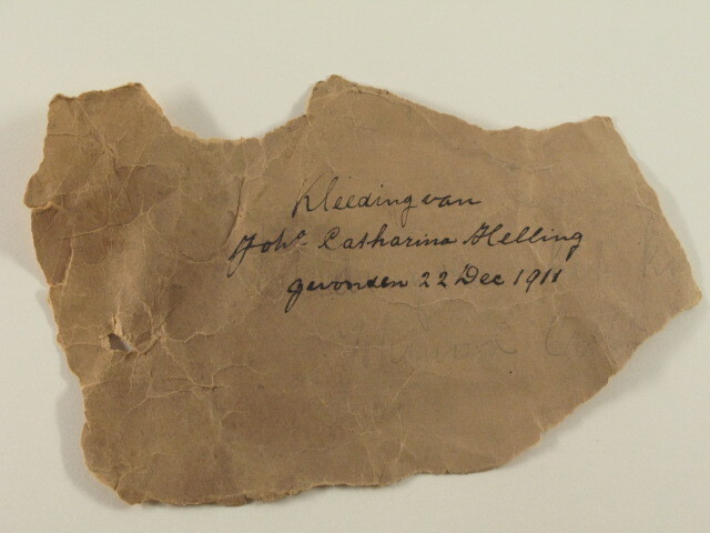 - opschrift op bruin papier: Kleeding van/ Joha Catherina Helling/ gevonden 22 Dec 1911