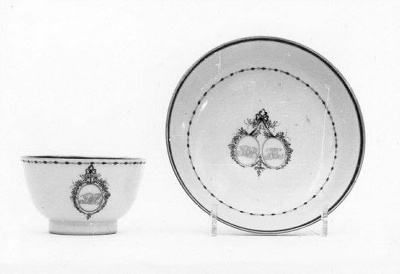 rond kopje zonder oor met diep schoteltje. Décor van médaillons aan paars lint met vergulde monogrammen ADB en HFAC- HerkomstTheeservies voor 350 gulden op 29 mei 1889 door S.A. Lopez Suasso-De Bruijn aangekocht; legaat van mevrouw S.A. Lopez Suasso-de Bruijn, Amsterdam, 1890.