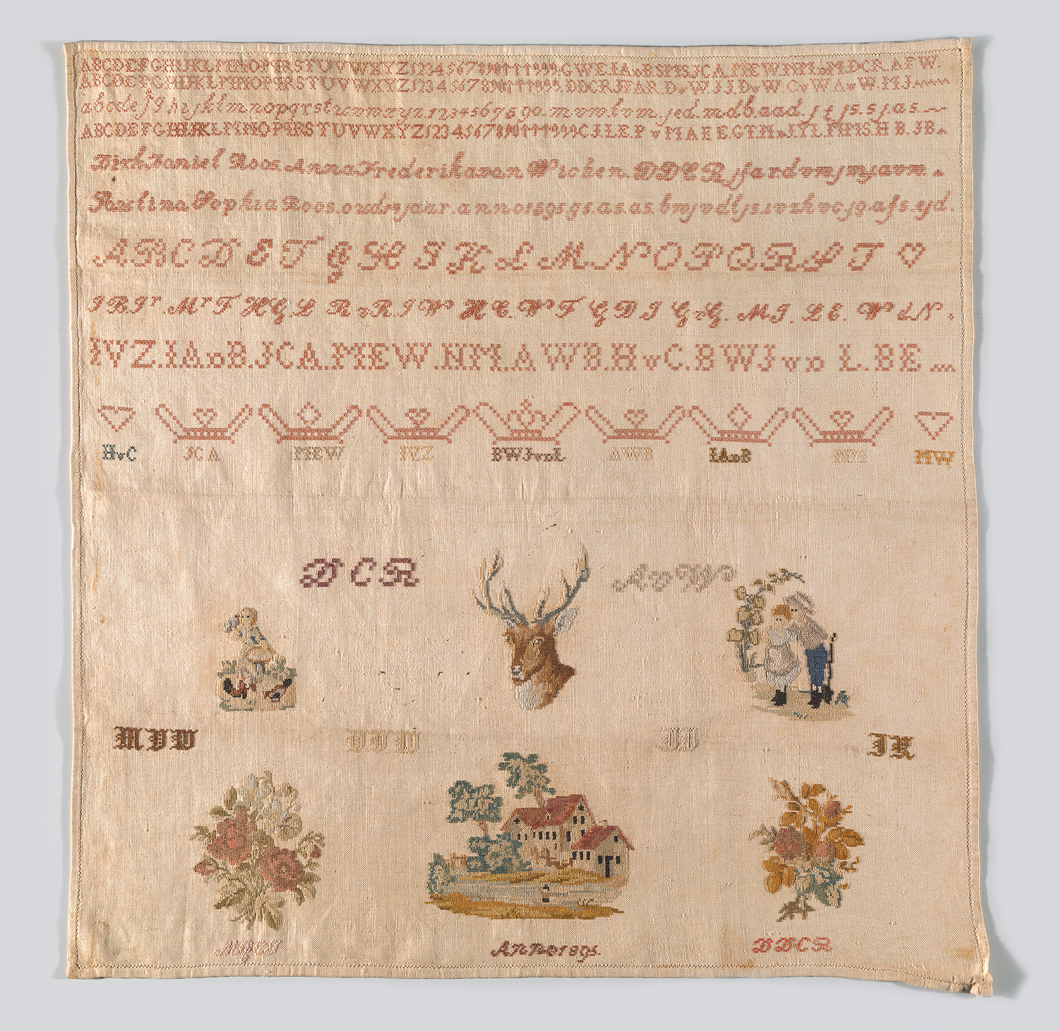 opschrift tussen de motieven, eerste regel: DCR / AvW: DCR: Dirk Cornelis Roos, van der van borduurster