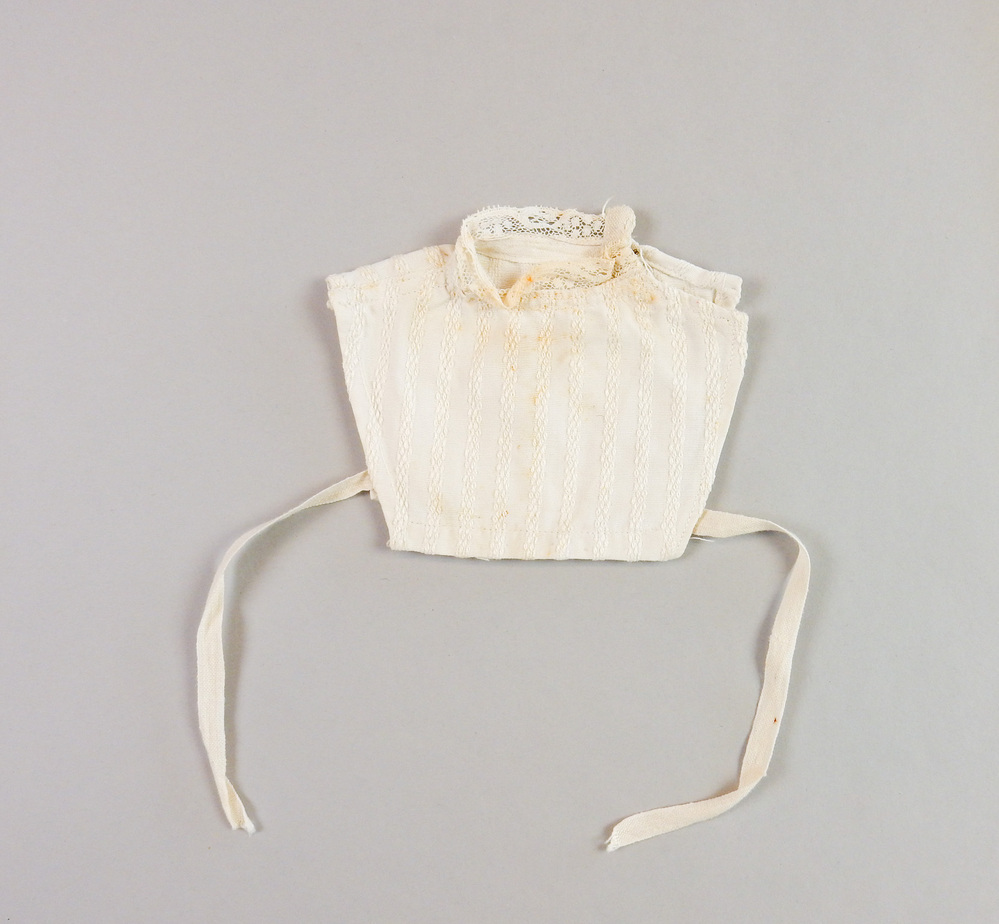 Frontje van katoen, met ingeweven fantasiestreep. Linker open schoudernaad gesloten bij de hals met een ijzeren haakje en een stoffen lusje. Achter op taille twee lintjes, hals afgezet met bies en kant.- Trefwoorden
