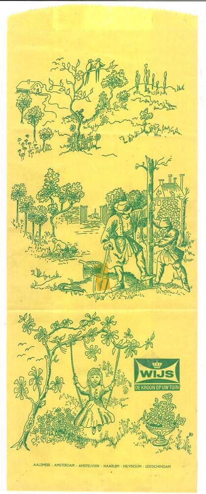 Gele zak met aan voorzijde in groene inkt een reproductie van prent 'De hovenier' van Luyken en logo van Fa. Wijs- Trefwoorden