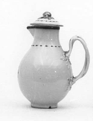 Vrucht als dekselknop. Décor van médaillons aan paars lint met vergulde monogrammen ADB en HFAC- HerkomstTheeservies voor 350 gulden op 29 mei 1889 door S.A. Lopez Suasso-De Bruijn aangekocht; legaat van mevrouw S.A. Lopez Suasso-de Bruijn, Amsterdam, 1890.