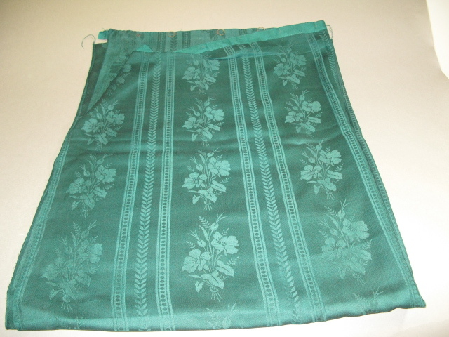 Groen damast geweven gordijn met 9 roestvrijstalen gordijnringen. Patroon: banen met bloemmotieven afgewisseld door verticale banen met een geometrisch patroon.- Trefwoorden