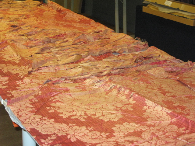 Damast geweven gordijn met in de lengterichting de kleuren licht en donker Bordeaux rood. Naturel ingeweven bloemmotieven en guirlandes.- Trefwoorden