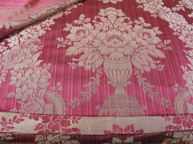 Stuk damast geweven gordijnstof, twee banen, met in de lengterichting de kleuren licht en donker Bordeaux rood. Naturel ingeweven bloemmotieven en guirlandes.- Trefwoorden