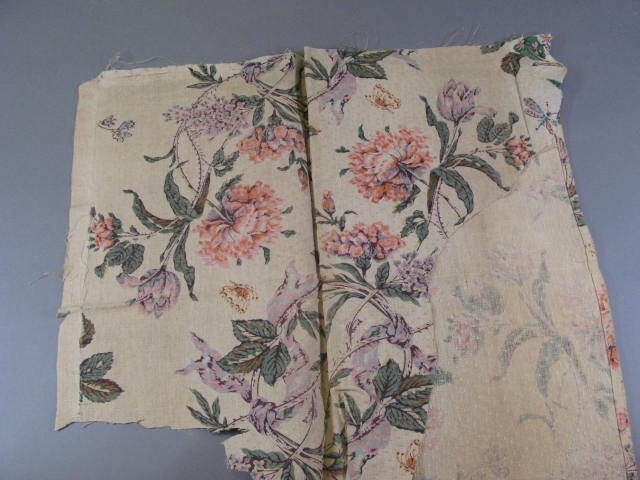 Fragment van de bekleding van de meubels uit de tuinkamer van Willet-Holthuizen. Ecru kleurig katoen damast bedrukt met bloemmotief in de kleuren roze, oranje, aubergine, groen, bruin en zacht blauw. Van het fragment is een deel afgeknipt, ook is er een stuk uitgeknipt.- Trefwoorden