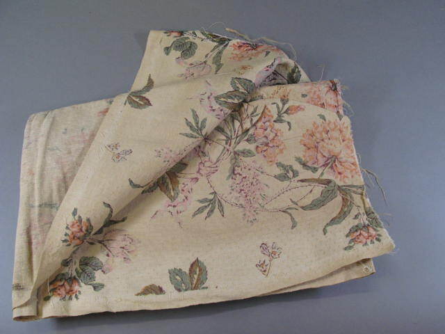 Fragment van de bekleding van de meubels uit de tuinkamer van Willet-Holthuizen. Ecru kleurig katoen damast bedrukt met bloemmotief in de kleuren roze, oranje, aubergine, groen, bruin en zacht blauw. Aan een zijde zijn trapsgewijs stukken uit het fragment geknipt.- Trefwoorden