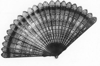 Zwartbruine empire brisé-waaier met benen met ingesneden motieven. Zwart lint langs de bovenzijde om de benen bij elkaar te houden. Hoewel zwart een rouwkleur is, is het ook een modekleur voor accessoires tijdens de empire periode.