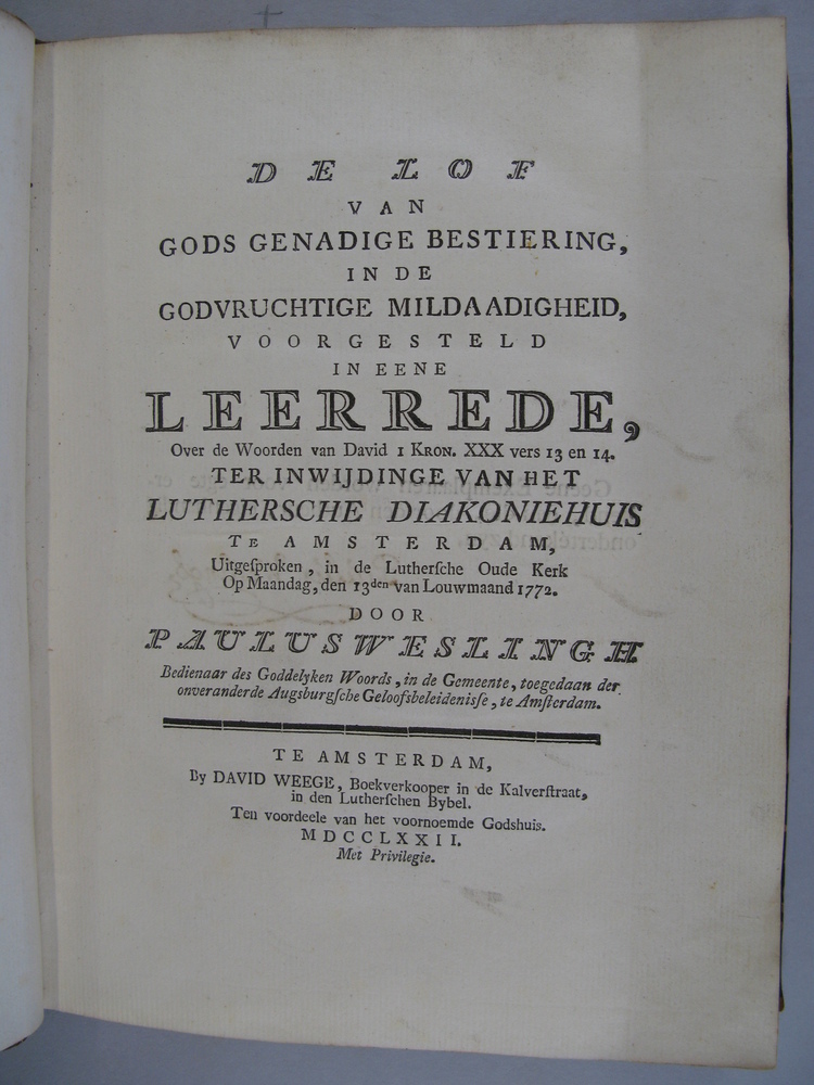 - De lof van Gods genadige bestieringh, in de godvruchtige mildaadigheid, voorgesteld in eene leerrede [...]. - Amsterdam, David Weege, 1772, 1772