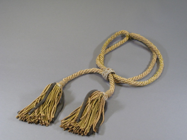 Linnen embrasse met twee kwasten, omwikkeld met geel kleurig zijde.- Trefwoorden