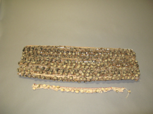 Drie stuks ecru gekleurd embrasse versierd met bolletjes in rood en groen. Daarbij nog een apart verpakt embrasse.- Trefwoorden
