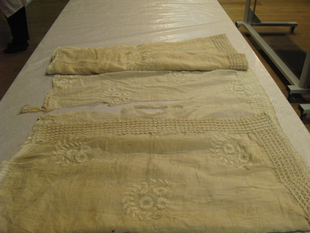 Fijn doorzichtig weefsel in linnenbinding. Met bloem en blad motief. Aan een zijde met hand opgenaaid band.- Trefwoorden