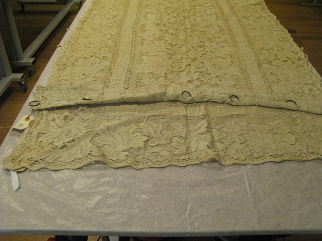 Linnen vitrage met 7 koperen ringen. Aan bovenzijde ingenomen.- Trefwoorden