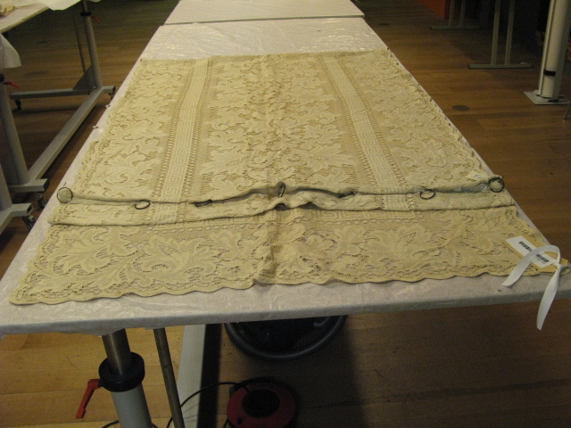 Naturel kleurige linnen vitrage met koperen ringen bevestigd op band. Aan bovenzijde een aantal keer omgevouwen. Zijkanten en onderkant afgezet met smal band.- Trefwoorden