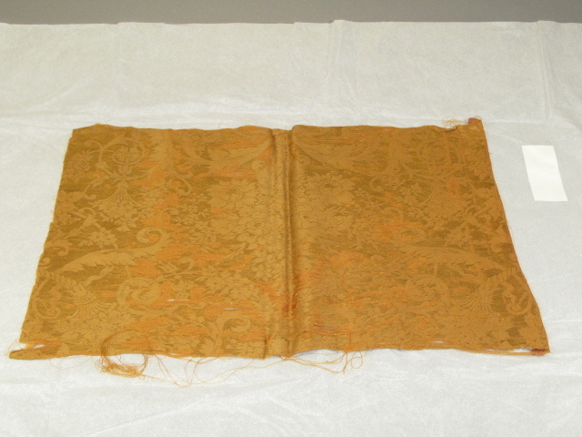 Fragment van overgordijn van Nederlandse Bank, goudgeel van kleur, brokaatweefsel. Bovenzijde afgezet met strook stof.- HerkomstHet gordijn heeft gehangen in de directeurskamer van de Nederlandsche Bank aan de Oude Turfmarkt (hiervan was overgrootvader, Willem Cornelis Mees (1813-1884), van de schenker, directeur).