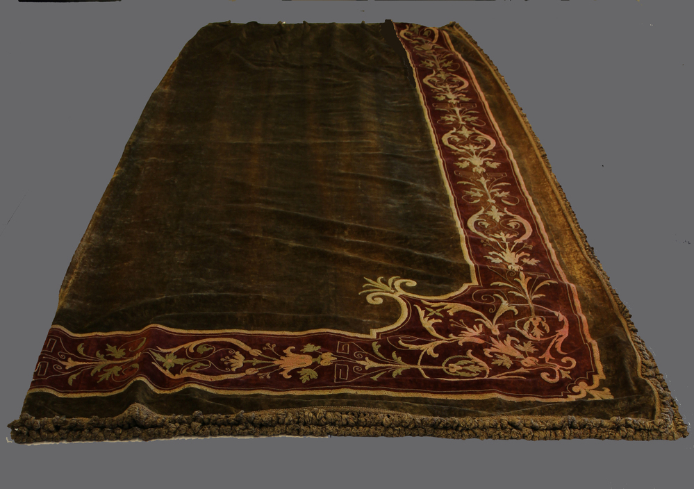 Velours gordijn in groen met rode baan met geborduurd floraal motief.- Trefwoorden