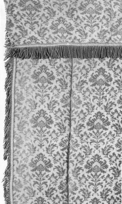 Bedrukt katoenen gordijn met voering. Aan een zijde en onderzijde met franje versierd. Bovenzijde met 11 gordijnringen met keperband afgezet.- Trefwoorden