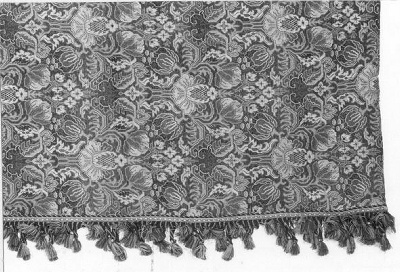 Meer kleurig koord bestaande uit omwikkelde draden met daaraan kwasten. In het koord zit deels een bundel ijzerdraadjes. Kwasten zijn meerkleurig bestaande uit een omwikkelde bol en hals. Bol heeft extra vlechtwerk van tresband in verschillende dikten. Boven de koorden van de kwast is een rand van ongetwijnde garen in lusjes bevestigd. De koorden van de kwast hebben een ongetwist uiteinde. Bol heeft een houten kern.