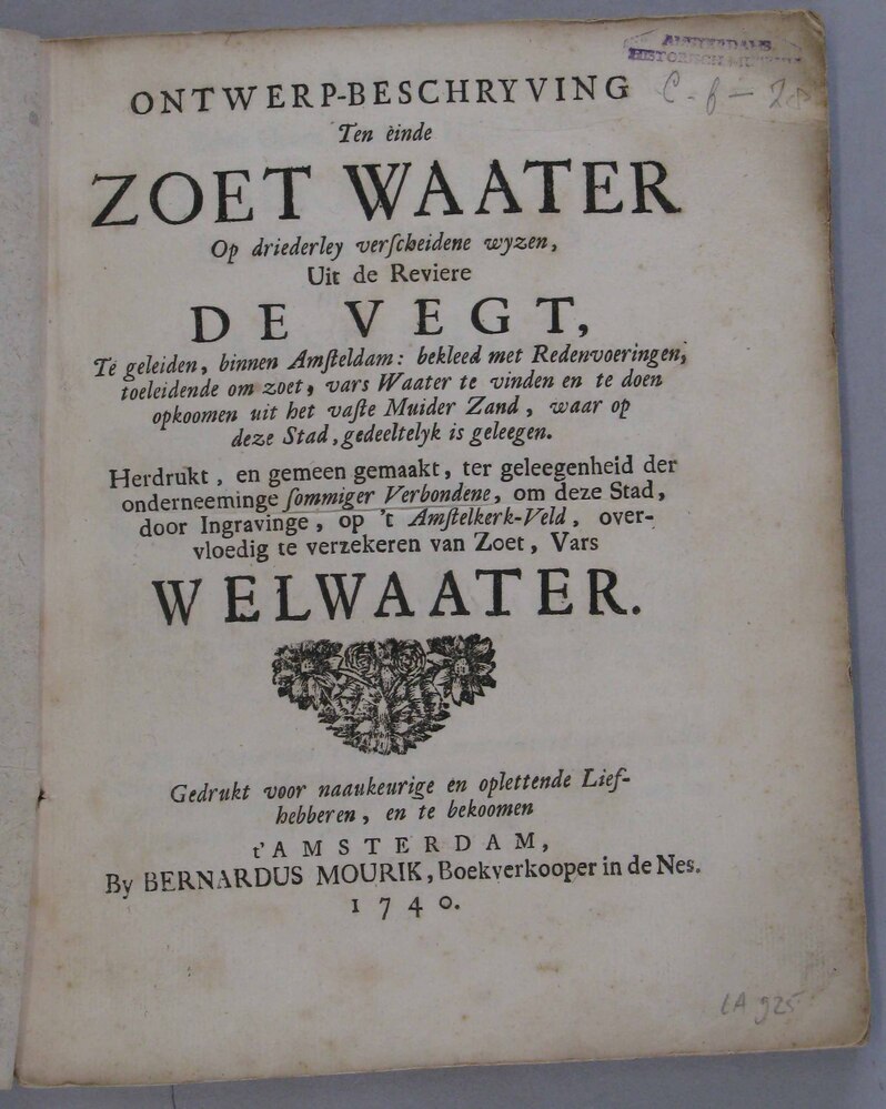 - Ontwerp-beschryving ten einde zoet waater op driederley verscheidene wyzen uit de Reviere de Vegt te geleiden binnen Amsteldam : bekleed met Redevoeringen, toeleidende om zoet, vars Waater te vinden en te doen opkoomen uit het vaste Muider Zand, waar op deze Stad, gedeeltelyk is gelegen.