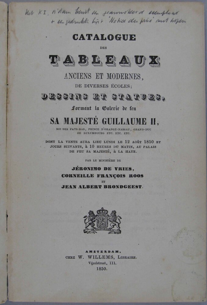- Catalogue des tableaux anciens et modernes, de diverses écoles, dessins et statues, formant la galerie de feu sa majesté Guillaume II [...] par le ministère de Jérome de Vries, Corneille Francois Roos et Jean Albert Brondgeest