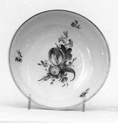- De schotel maakt deel uit van een 25-delig thee- en koffieservies. Zoals gebruikelijk bij zogenaamd ´Haags´ porselein werden de modellen uit een porseleinfabriek van elders (hier: Ansbach) betrokken, waarna deze in Den Haag van een bloemendecor werden voorzien. ( Bert Vreeken)