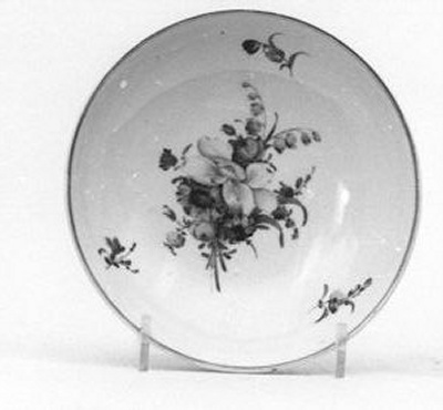 - De schotel maakt deel uit van een 25-delig thee- en koffieservies. Zoals gebruikelijk bij zogenaamd ´Haags´ porselein werden de modellen uit een porseleinfabriek van elders (hier: Ansbach) betrokken, waarna deze in Den Haag van een bloemendecor werden voorzien. ( Bert Vreeken)