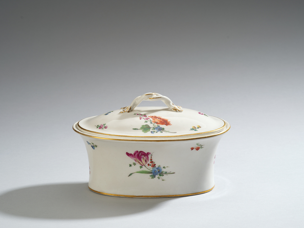 Klein, ovale terrine met deksel en ingesnoerde wand. Handvat van de deksel in de vorm van verstrengelde twijgjes. Veelkleurig beschilderd met bloemboeketten en strooibloemen en gouden biezen langs de randen. Merk: M:ol.- Trefwoorden