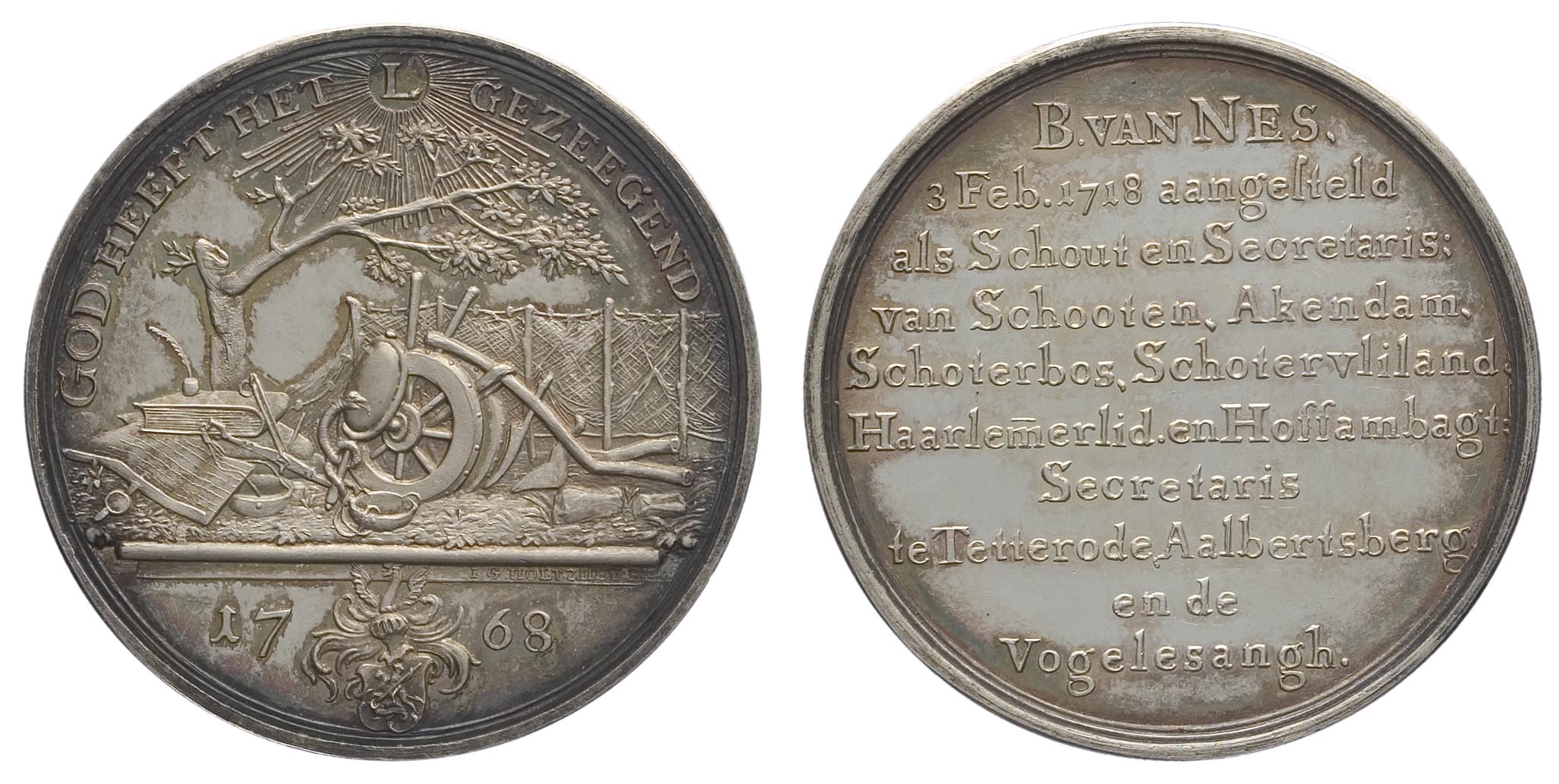 opschrift keerzijde: B. van Nes. / 3 Feb. 1718 aangesteld / als Schout en Secretaris: / van Schooten, Akendam, / Schoterbos, Schotervliland, / Haarlemerlid.enHoffambagt: / Secretaris / te Tetterode Aalbertsberg / en de / Vogelesangh.