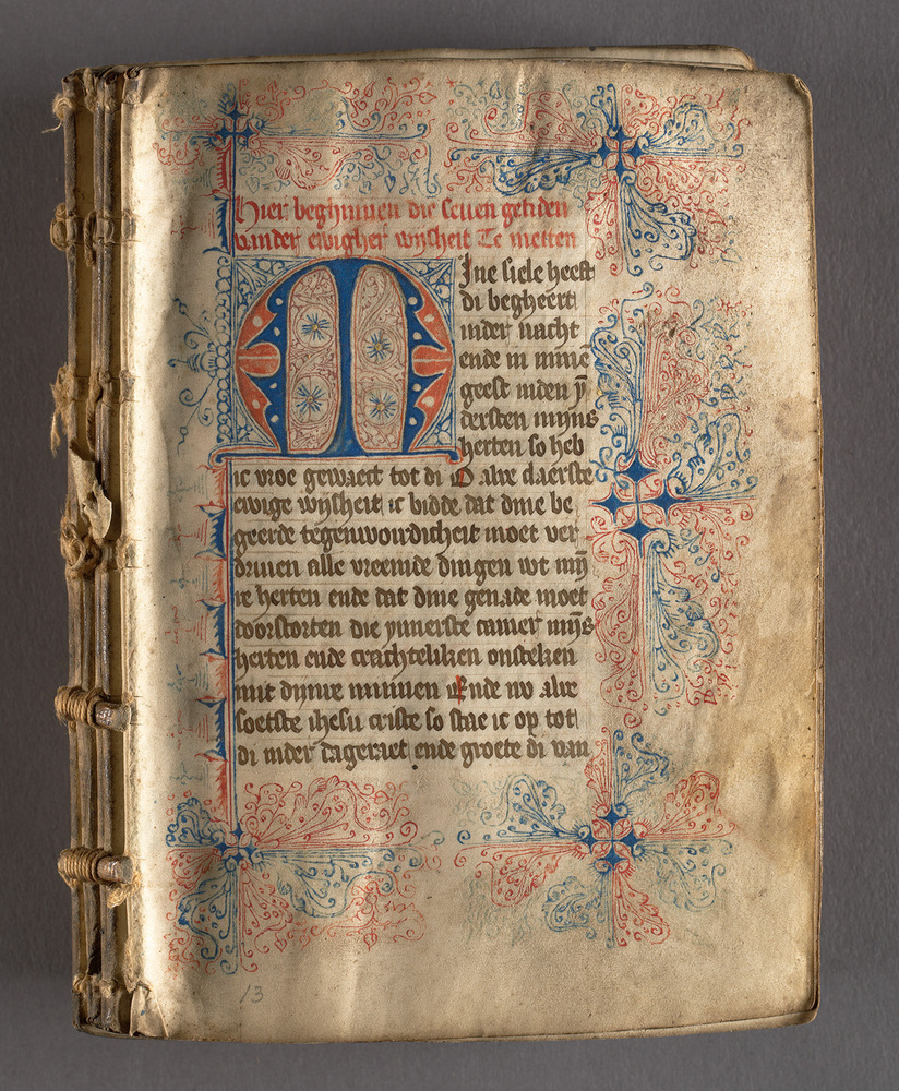 Gothisch schrift, met rood of blauw gekleurde hoofdletters en vele initialen en randversieringen, niet gebonden; de eerste bladzijden zijn zeer beschadigd. 310 p.- Trefwoorden