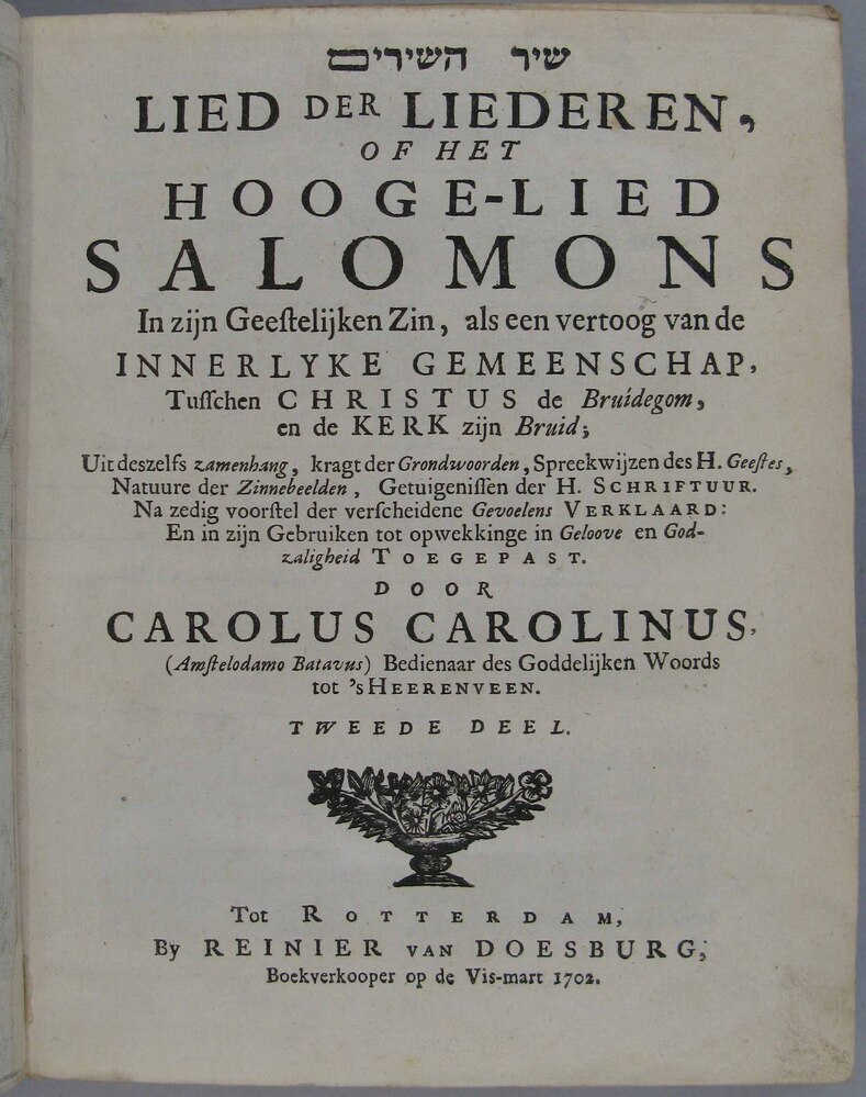 - Lied der liederen, of het hooge-lied Salomons. In zijn geestelijken zin, als een vertoog van de innerlyke gemeenschap, tusschen Christus de Bruiegom, en de Kerk zijn Bruid, ...