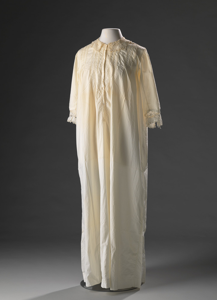 Lange nachtjapon met kant afgezet aan mouwuiteinden en hals. Aan voorzijde kleine platte plooitjes en aan de achterzijde tevens geplooid op de rug. Aan voorzijde sluiting door middel van knoopjes. Middenvoor links een monogram met de letters 'AS'.