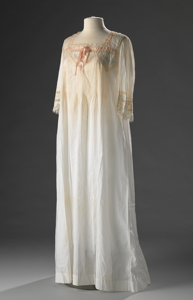 Nachtjapon met wijduitlopende mouwen. Mouwuiteinden, langs de hals en boven de borst versierd met kant en borduursel. Rechts boven de borst is nog biorduurtekening te zien. Links en rechtts onder de oksel staat tekst, links: '46', rechts '10620 3962'. Middenvoor zitten kleine, smalle plooitjes. Achter drie grote platte plooien, links boven voor, monogram met letters 'AS'.
