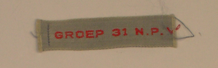 grijs lint met daarop geborduurd in rode letters "groep 31 N.P.V.", met niet afgewerkte uiteinden, letter "V"is halverwege afgeknipt- Trefwoorden