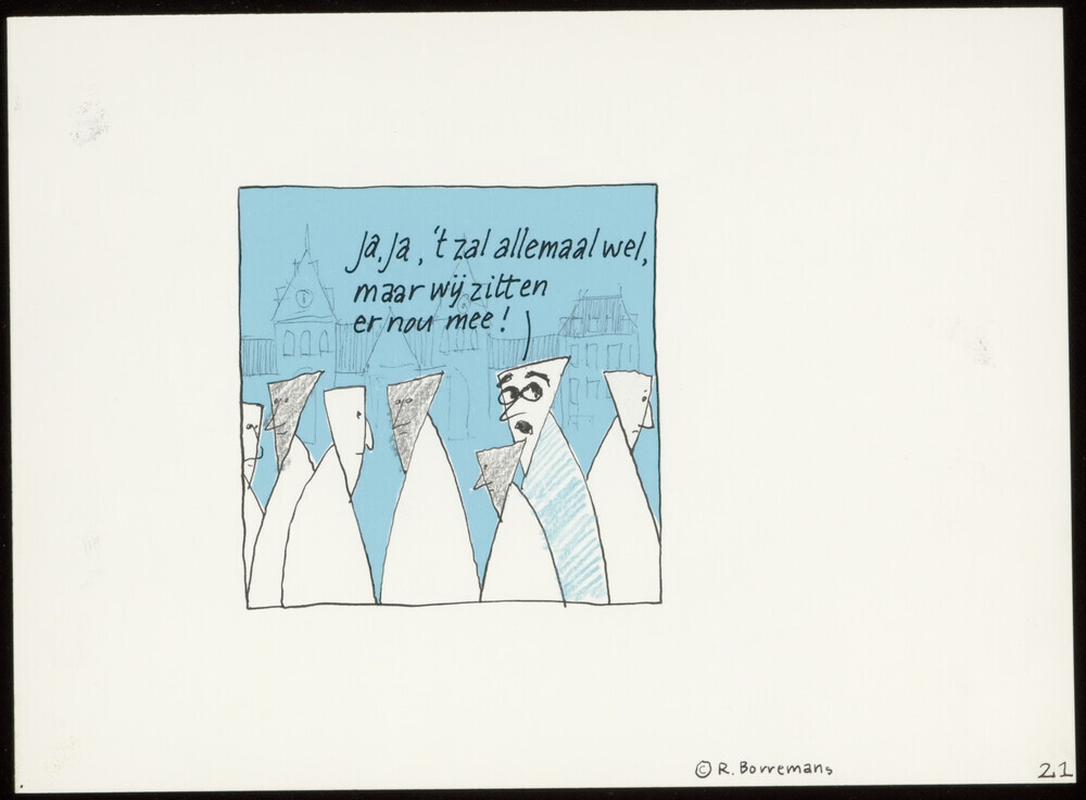 - opschrift voorzijde: Ja, Ja, 't zal allemaal wel, // maar wij zitten // er nou mee!