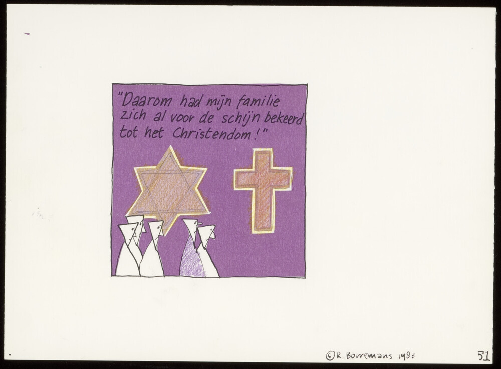 - opschrift voorzijde: "Daarom had mijn familie // zich al voor de schijn bekeerd // tot het Christendom!"