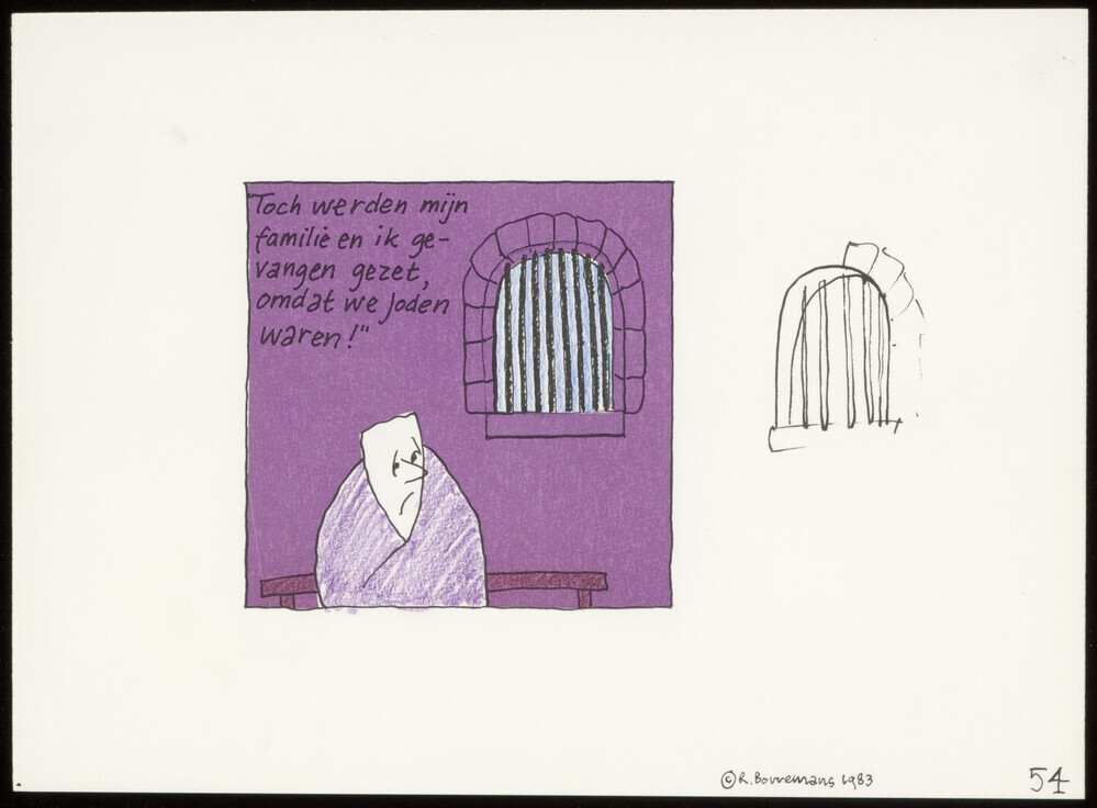 opschrift voorzijde: "Toch werden mijn // familie en ik ge- // vangen gezet, // omdat we joden // waren!"
