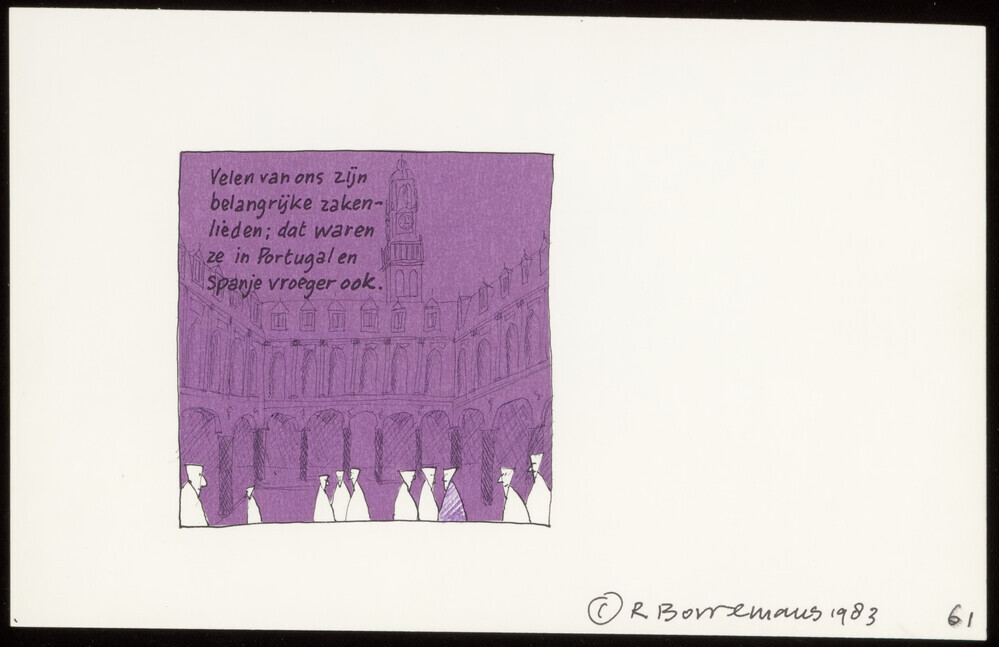 opschrift voorzijde: Velen van ons zijn // belangrijke zaken- // lieden; dat waren // ze in Portugal en // Spanje vroeger ook.