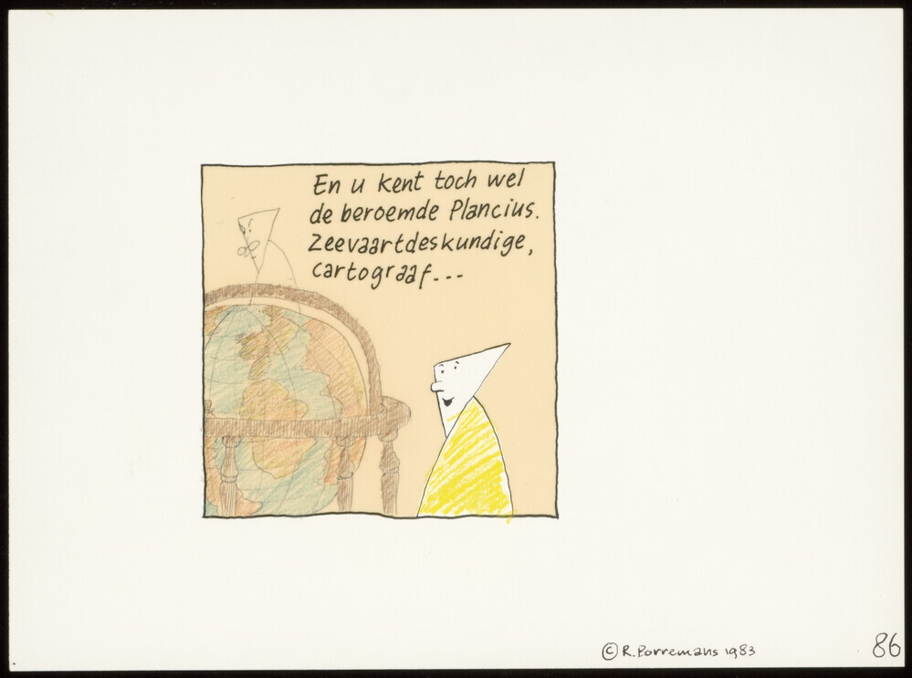 opschrift voorzijde: En u kent toch wel // de beroemde Plancius. // Zeevaartdeskundige, // cartograaf...