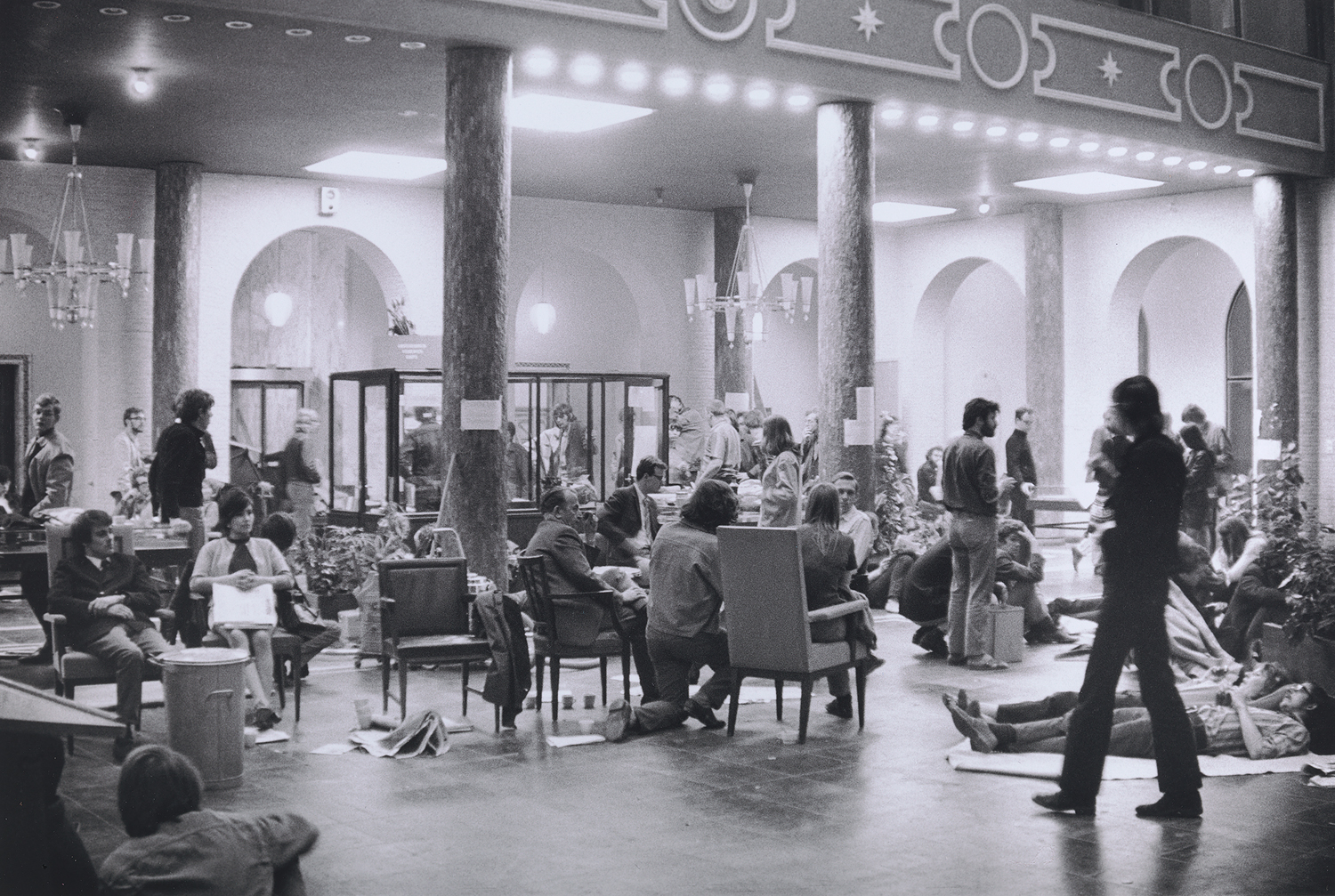 Maagdenhuisbezetting: Hal van Maagdenhuis, mei 1969, 1969 Amsterdam papier hoogte a: 33.4 cm; breedte a: 45.4 cm; hoogte c: 25.7 cm; breedte c: 38.4 cm; titel/datering/signatuur achterzijde: Maagdenhuisbezetting - mei 1969/ c PAUL VAN RIEL/ Hal van Maagdenhuis,/ Adm. Univ. v. A'dam - Spui