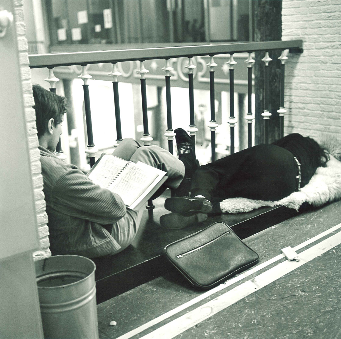 - titel/datering/signatuur achterzijde: Maagdenhuisbezetting, mei 1969/ Omloop van hal van M.-huis/ c PAUL VAN RIEL