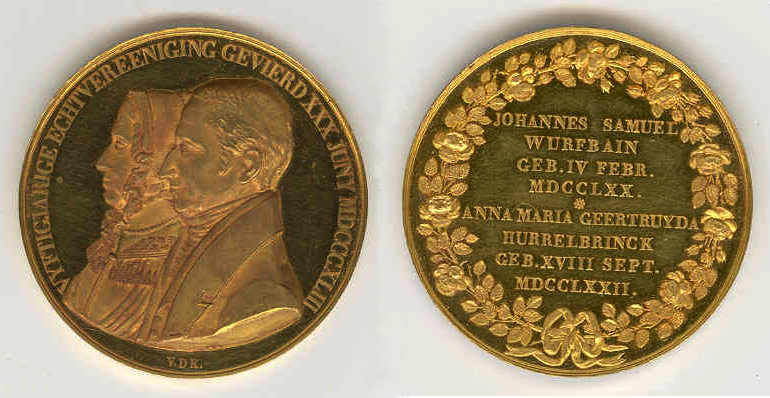 omschrift voorzijde: VYFTIGJARIGE ECHTVEREENIGING GEVIERD XXX JUNY MDCCCXLIII