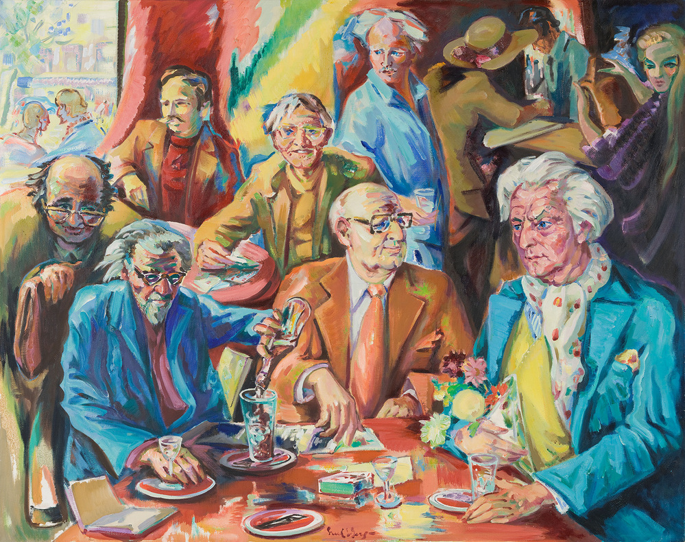 De dichter Gerard den Brabander zit links voor op Van den Bergs kunstwerk. Hij schenkt net iets in. De man achter in blauwe kiel is de schilder zelf.