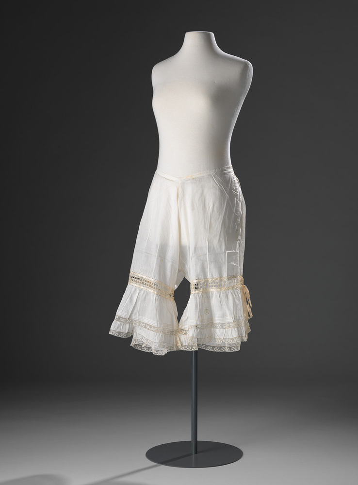Witte onderbroek met open zijkanten die geslten worden door linten. Hieraan bevestigd zijn wijdere pijpjes van katoen, afwisselend met kanten stroken. Door het vovenste kant zijn rondom twee linten verwerkt die aan de zijkant sluiten met een strik. Met extra ingezet stuk in het kruis. Middenop het linkerpijpje is monogram 'AS' geborduurd. Onderaan de pijpjes zitten platte plooien.