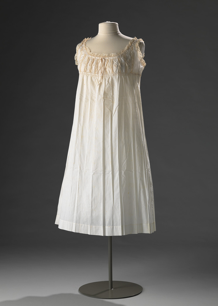 Wit hemd met versierd bovenlijfje. Stroken kant afgewisseld met katoen. Op het katoen zijn cirkels kant aanwezig. Tussen het lijfje en de rok en bij de hals is hardanjer kqant geplaatst, met hier doorheen een lintje. Links bovenin is een monogram genaaid met de letters 'AS'. Het hemd sluit op de schouders met een knoopje.