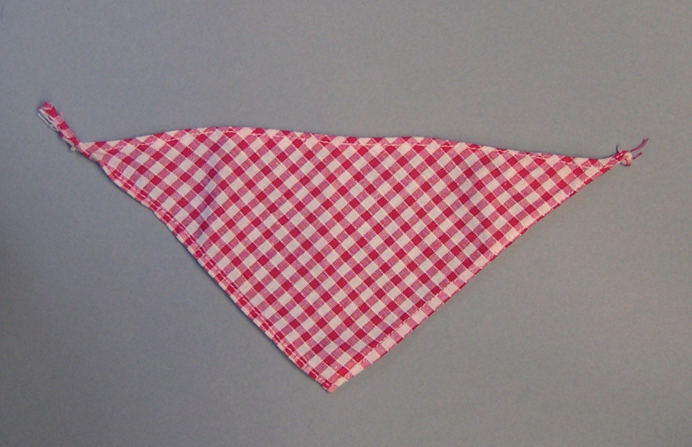 Driehoekig hoofddoekje van rood-wit geblokt katoen.- Trefwoorden
