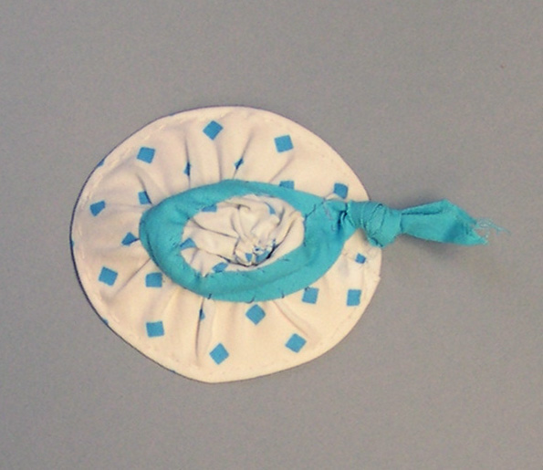 Hoed met brede rand van wit katoen met blauwe ruitjes. Om hoedje is blauwe band geknoopt.- Trefwoorden